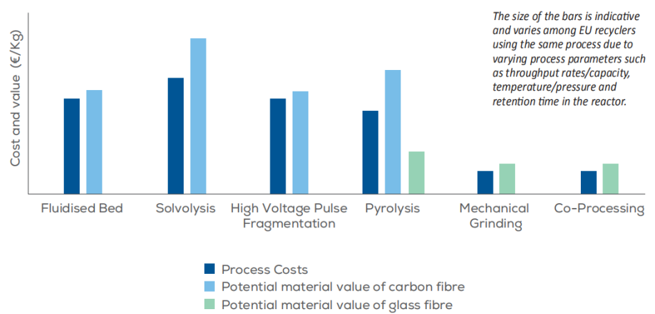 图9、复合材料回收技术的估计相对成本和价值