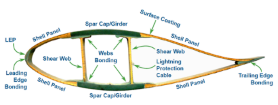 | 翼梁盖/大梁:单向(UD)玻璃/碳纤维,由环氧,聚酯,聚环氧乙烷或乙烯基酯基支撑 剪切腹板和壳板:以Balsa / PVC / PET为核心材料,并以环氧树脂,聚酯纤维,聚环氧丙烷或乙烯基酯为基质的多轴GFRP夹层板 前缘/后缘和腹板粘合:环氧/聚四氟乙烯结构胶 防雷电缆:铝或铜 表面涂层:聚环氧丙烷基漆 LEP(前缘保护):聚环氧丙烷基漆/胶布 |